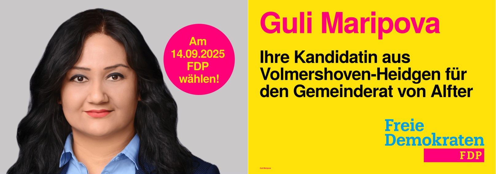 Liebe Nachbarn, liebe Freunde! Am Sonntag, den 14. September 2025 findet in Nordrhein-Westfalen die Kommunalwahl statt. Ich bin Ihre Kandidatin aus Volmershoven-Heidgen für den Gemeinderat von Alfter.